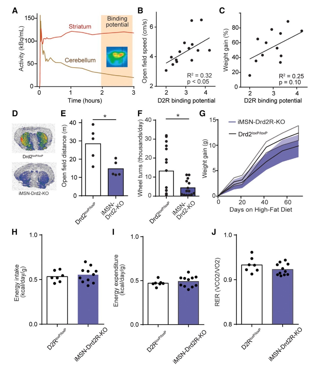 上面结果证明肥胖减少D2R和多巴胺的结合,从而导致小鼠的运动减弱,那么D2R水平降低导致运动减弱后是否会使小鼠更容易肥胖呢?作者在iMSNs中特异的敲除D2R基因,结果发现小鼠的运动减弱(图5D-5F),但是D2R敲除小鼠的进食和能量消耗和野生型小鼠相比没有差异,因此其体重相对野生型小鼠也没有出现差异(图5G-5J)。这说明肥胖是引起的小鼠运动减弱的原因,而D2R的多巴胺信号并不会导致肥胖的发生。