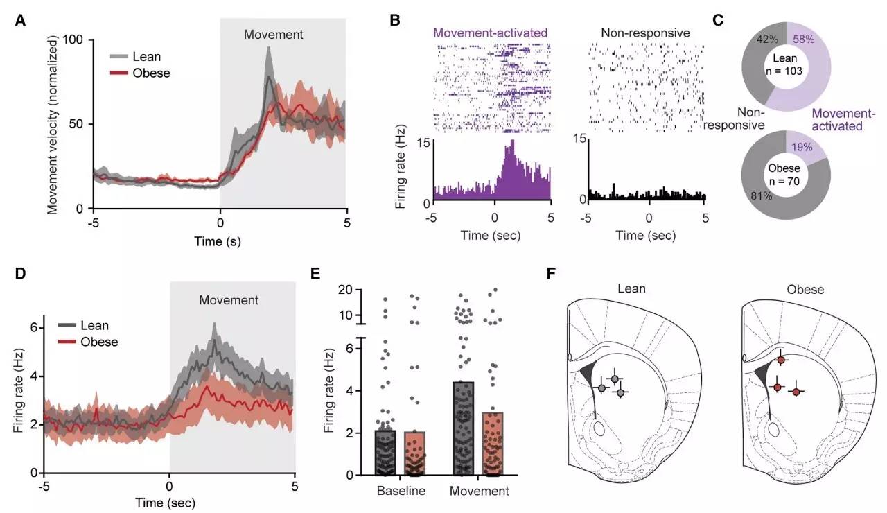那么纹状体的D2R和多巴胺的结合减少是如何影响纹状体神经元活动,从而导致运动减少的呢?作者发现肥胖小鼠和瘦小鼠的运动速度是没有差异的(图3A),因此作者怀疑是运动相关的神经元的放电频率发生了变化,作者检测了背内侧纹状体神经元的电生理活动(图3F),发现肥胖小鼠中运动时的神经元放电频率明显降低(图3B-3E)。