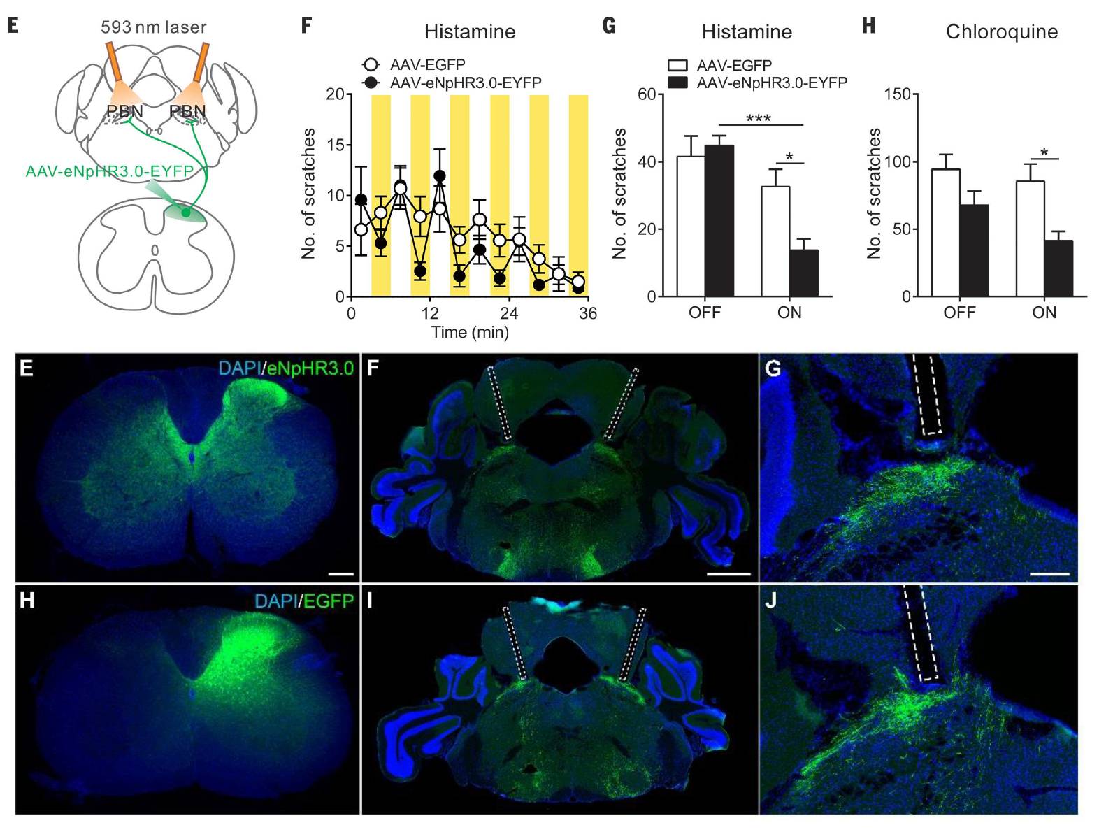 为了进一步检验脊髓-臂旁核的投射在痒诱发的搔痒行为中起到如何作用,作者利用光遗传学手段进行研究。借助AAV病毒载体,作者在脊髓神经元表达eNpHR3.0这种抑制性的光敏感通道(图2),并通过在臂旁核植入光纤,抑制脊髓-臂旁核的投射,发现抑制该通路会明显减少组胺或氯喹导致的小鼠搔痒行为(图2),同时小鼠的运动没有收到影响。