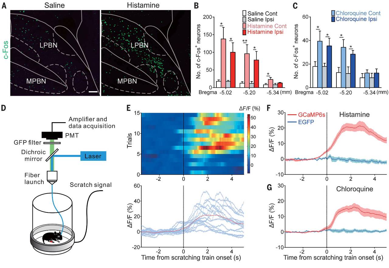 首先,搔痒产生后,臂旁核神经元的活动显著上升(c-Fos表达上调,图4A-C)。而后,通过在臂旁核神经元利用AAV载体表达GCaMP6s(钙敏感蛋白),作者借助光纤记录采集了臂旁核神经元在痒感受中的活动,发现痒觉抓挠行为中,臂旁核神经元活动增多(图4D-G)。