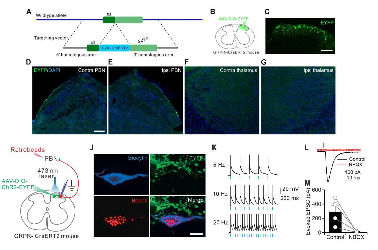 根据之前陈宙峰研究员和孙衍刚研究员的重要研究[1],脊髓中表达胃肠道释放素受体(GRPR)的神经元对于痒的信号处理非常关键,文章接下来分析了该类神经元在脊髓-臂旁核投射通路中的作用。