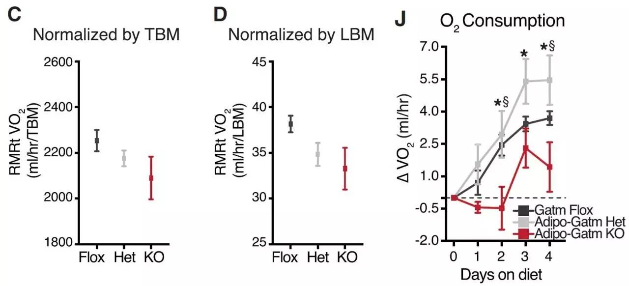 非常有意思的是,作者发现Gatm敲除小鼠的基础代谢率,在矫正体重和肌肉含量后明显降低(下图C、D)。作者进一步观察长效高脂饮食发现,和人的研究结果一致,高脂饮食后野生型小鼠的代谢率会上升(下图J灰线),也就是前文介绍的“进食热效应”,而Gatm敲除后“进食热效应”会明显的被抑制(下图J红线)。这提示肌酸可能参与了“进食热效应”。