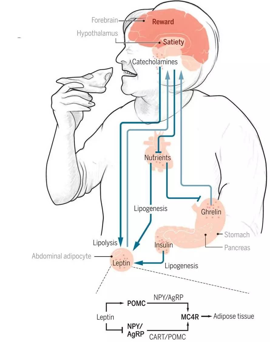 而脂肪细胞中脂肪过度积累后会分泌瘦素(leptin),瘦素作用于丘脑激活POMC神经元、抑制AgRP神经元,从而抑制进食。同时丘脑可以分泌儿茶酚胺促进脂肪细胞中甘油三酯的分解[1-3]。
