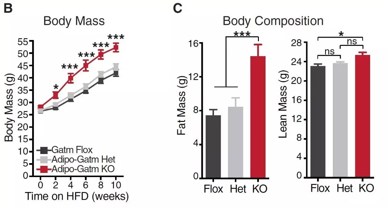 该项研究中,和预期相符Gatm敲除小鼠在高脂喂养后体重增加相比野生型和杂合小鼠更加明显(下图左红线),同时体脂含量更高(下图右红色柱子)。