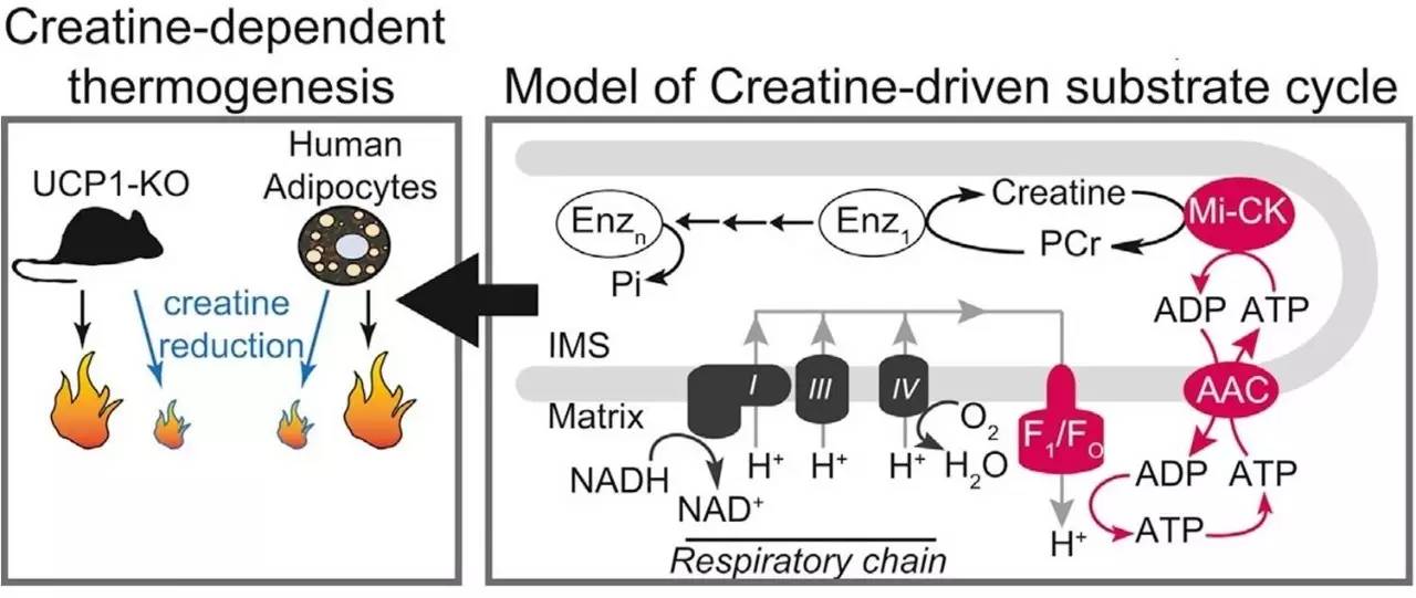 2015年哈佛医学院的Spiegelman教授在Cell上发表文章,发现肌酸(Creatine)可以促进米色脂肪组织的产热,并且是不依赖于UCP1的新产热途径[7]。那么新发现的肌酸促进产热途径,是否是“进食热效应”的通路呢?