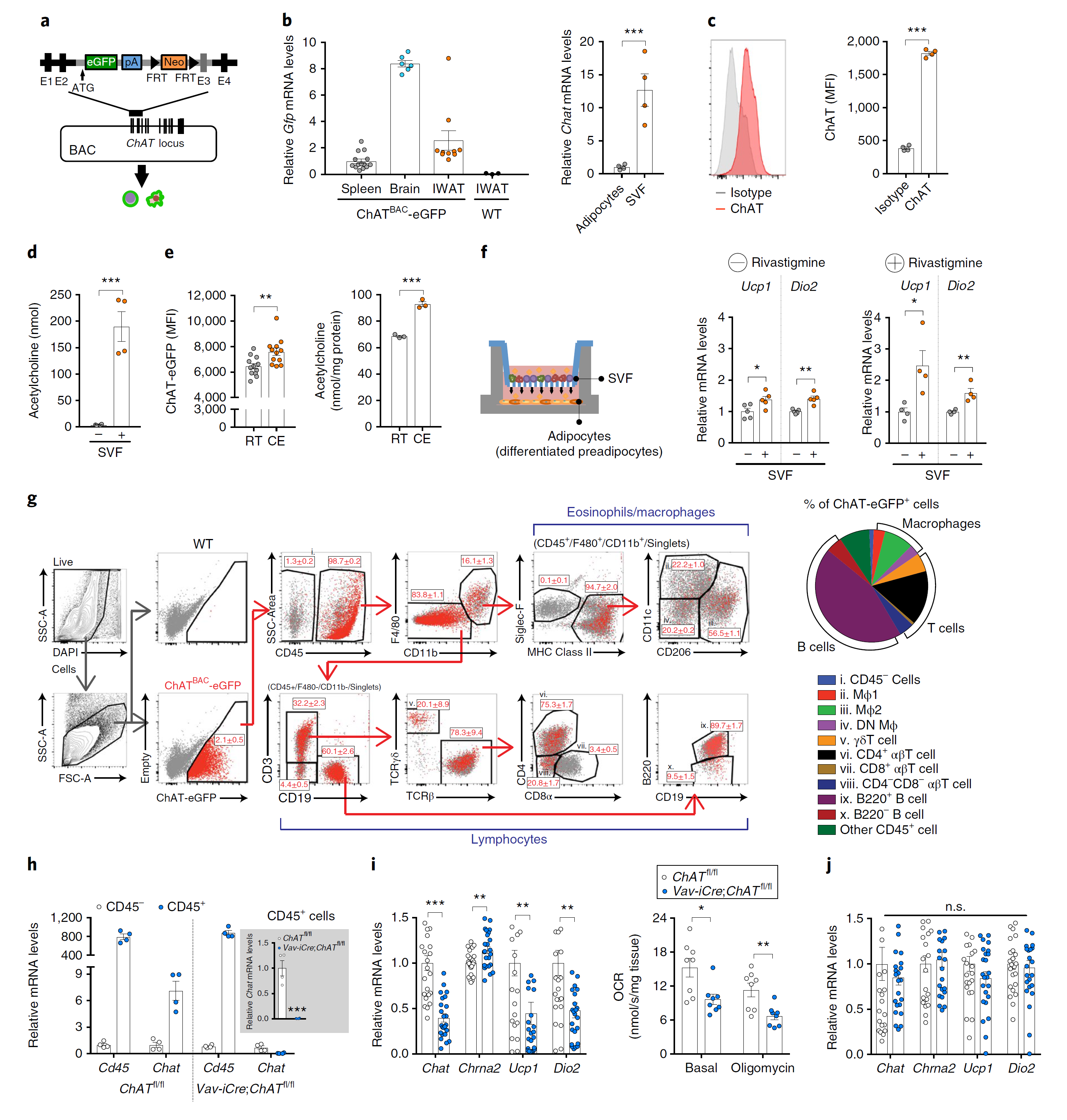 作者分析了ChAT-eGFP小鼠的GFP 细胞,ChAT为乙酰胆碱合成过程的限速酶,为合成乙酰胆碱的细胞的标志物。结果发现脾脏、大脑和腹股沟白色脂肪组织(IWAT)中GFP转录水平较高,而ChAT基因的转录、翻译和乙酰胆碱的分泌主要发生在基质血管成分(SVF)细胞而不是脂肪细胞中(图3a-d)。进一步,作者对小鼠进行低温处理来诱发脂肪组织产热,发现乙酰胆碱的分泌量与ChAT的表达量均显著上升,表明SVF分泌的乙酰胆碱参与CHRNA2的诱导过程(图3e-f)。
