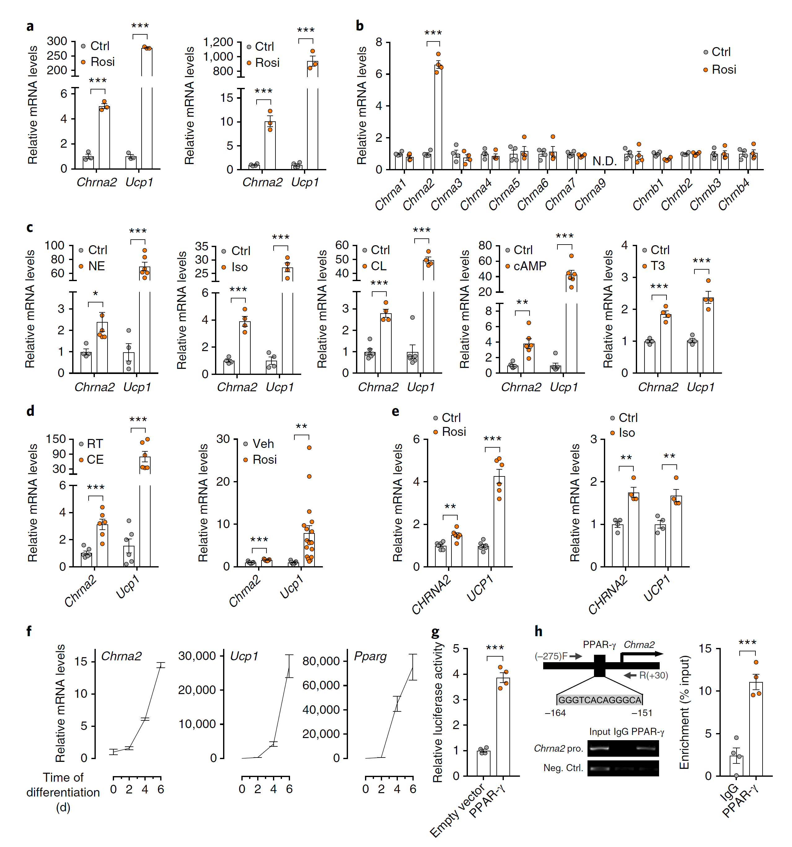 接下来,作者尝试多种诱导脂肪细胞米色化的手段,包括去甲肾上腺素、异丙肾上腺素、CL-316243、cAMP、三碘甲状腺氨酸等诱导物,低温或Rosi处理的体内验证实验,甚至使用Rosi处理人类原代脂肪基质细胞,得到了相同的现象,即米色化之后,Ucp1 与Chrna2的mRNA含量显著升高(图1c-e)。此外,在前脂肪细胞分化为脂肪细胞过程中,Ucp1、PPAR-γ、Chrna2的mRNA水平均逐渐提高,而且PPAR-γ在Chrna2启动子区域富集,促进Chrna2转录水平(图1f-h)。
