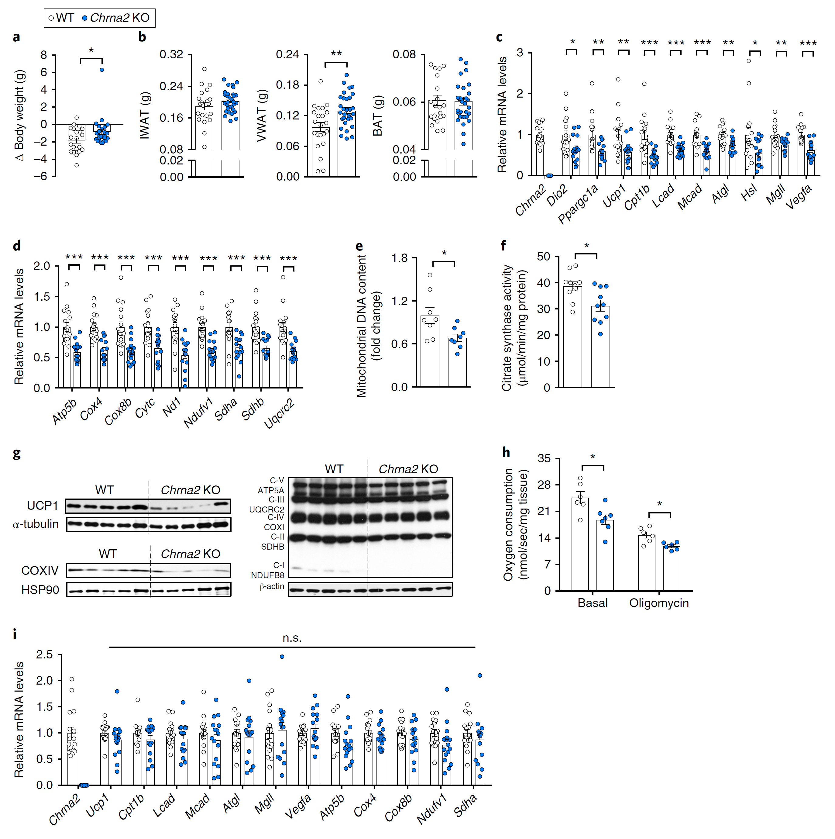 为探究乙酰胆碱-CHRNA2信号通路的生理功能,作者低温处理小鼠,发现CHRNA2敲除鼠体重降低量较小,内脏白色脂肪组织(VWAT)含量更高,IWAT中产热相关基因和脂肪酸氧化、分解相关基因的表达量更低(图4a-d),线粒体基因和线粒体功能标志物柠檬酸的表达量更低,呼吸耗氧量更低(图4e-g),但在BAT中这些基因表达正常(图4i)。