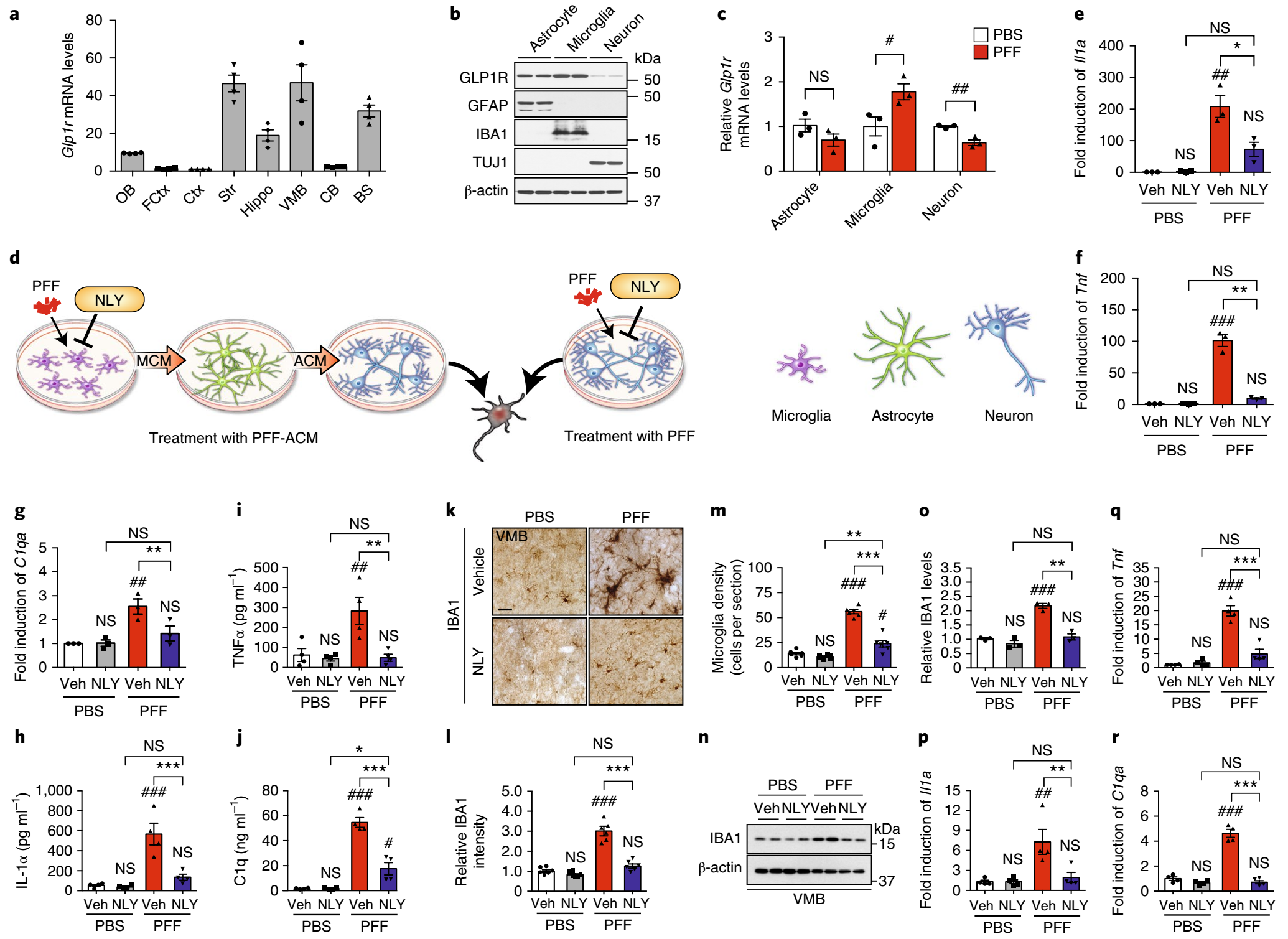 他们发现GLP1R大量表达于纹状体、脑干和中脑腹侧,并且主要表达在小胶质细胞中,在星形胶质细胞中也有适量表达,而在神经元中表达量较低(图3a-b)。α-syn PFF会降低神经元中GLP1R的表达,而增加小胶质细胞中GLP1R的表达(图3c)。