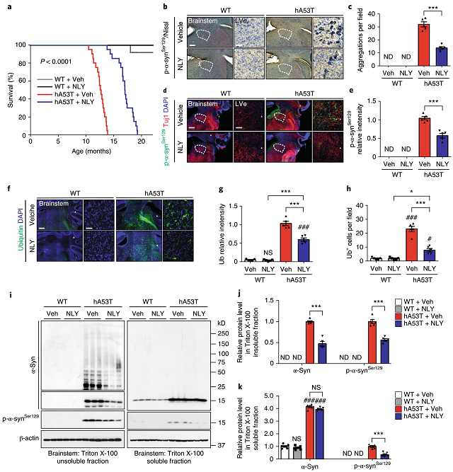 接下来,作者在致死型hA53T α-syn转基因帕金森模型鼠中展开研究[4]。他们发现NLY01可延长hA53T α-syn小鼠寿命长达100天(图2a),p-α-synSer129与泛素的高表达、α-syn的堆积、以及不溶于Triton X-100的p-α-synSer129、α-syn的积累等症状均有所缓解(图2 b-k)。