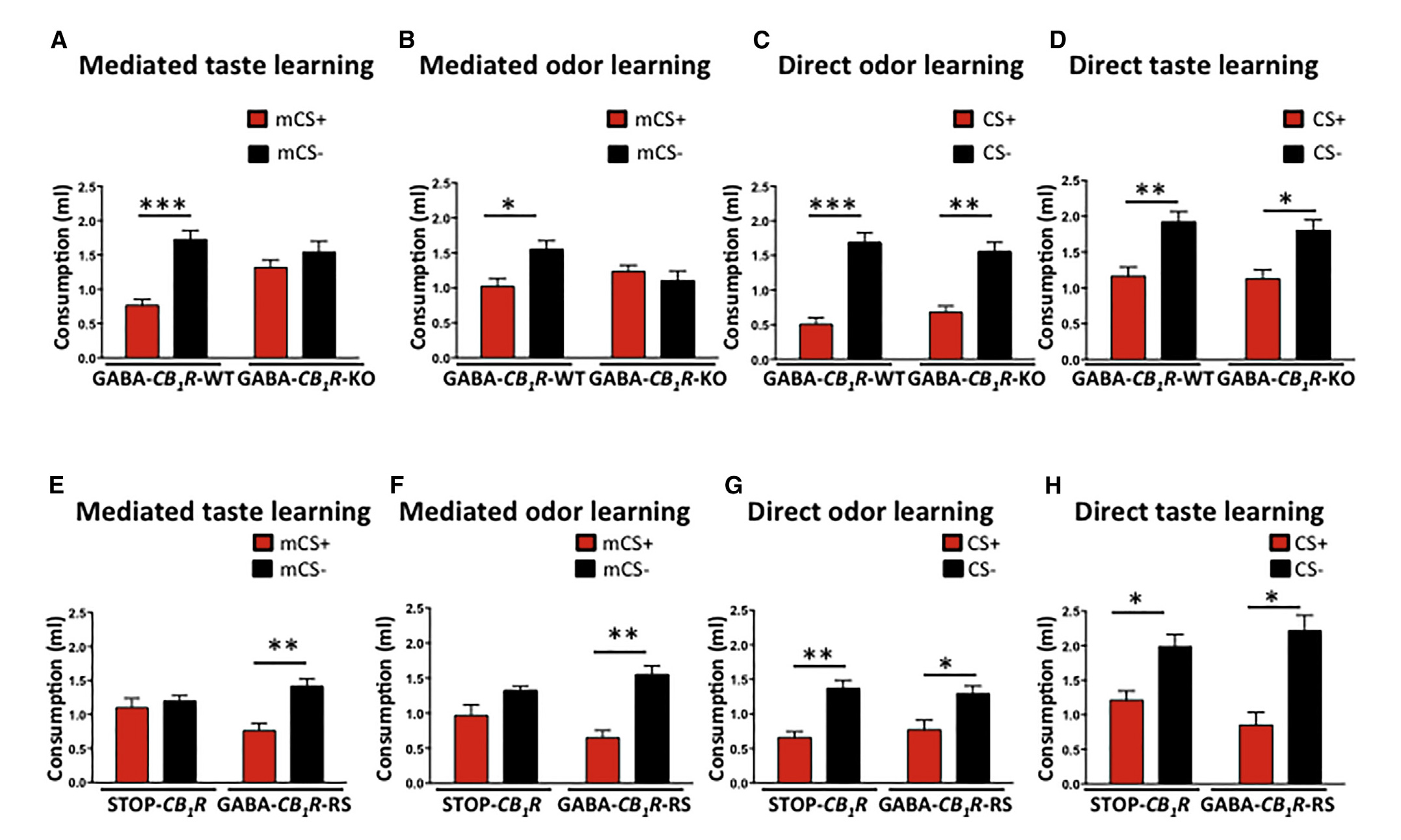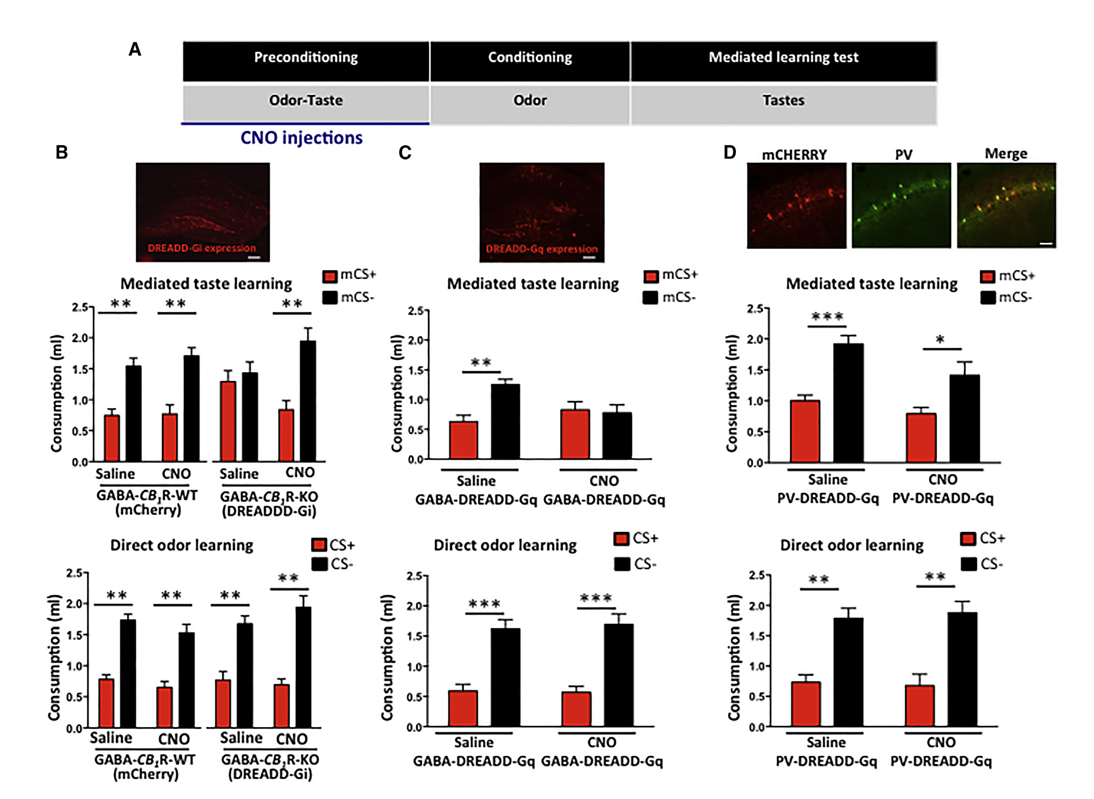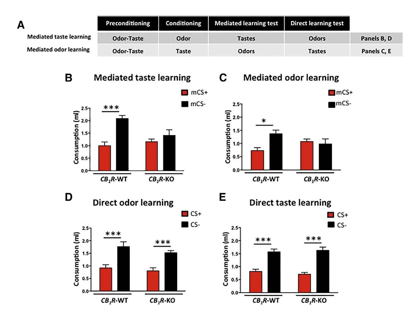 通过感觉预条件刺激实验(图1A),作者观察到野生型小鼠经CS (条件刺激)或mCS (介导性条件刺激)均消耗较低的味道或气味量,这表明野生型小鼠已形成明显的介导性厌恶学习和直接厌恶学习。有趣的是,CB1R敲除小鼠(CB1R-KO)经CS 表现出直接学习能力,但mCS 作用不明显(图1B-E),这表明CB1R是介导学习的必要因素。