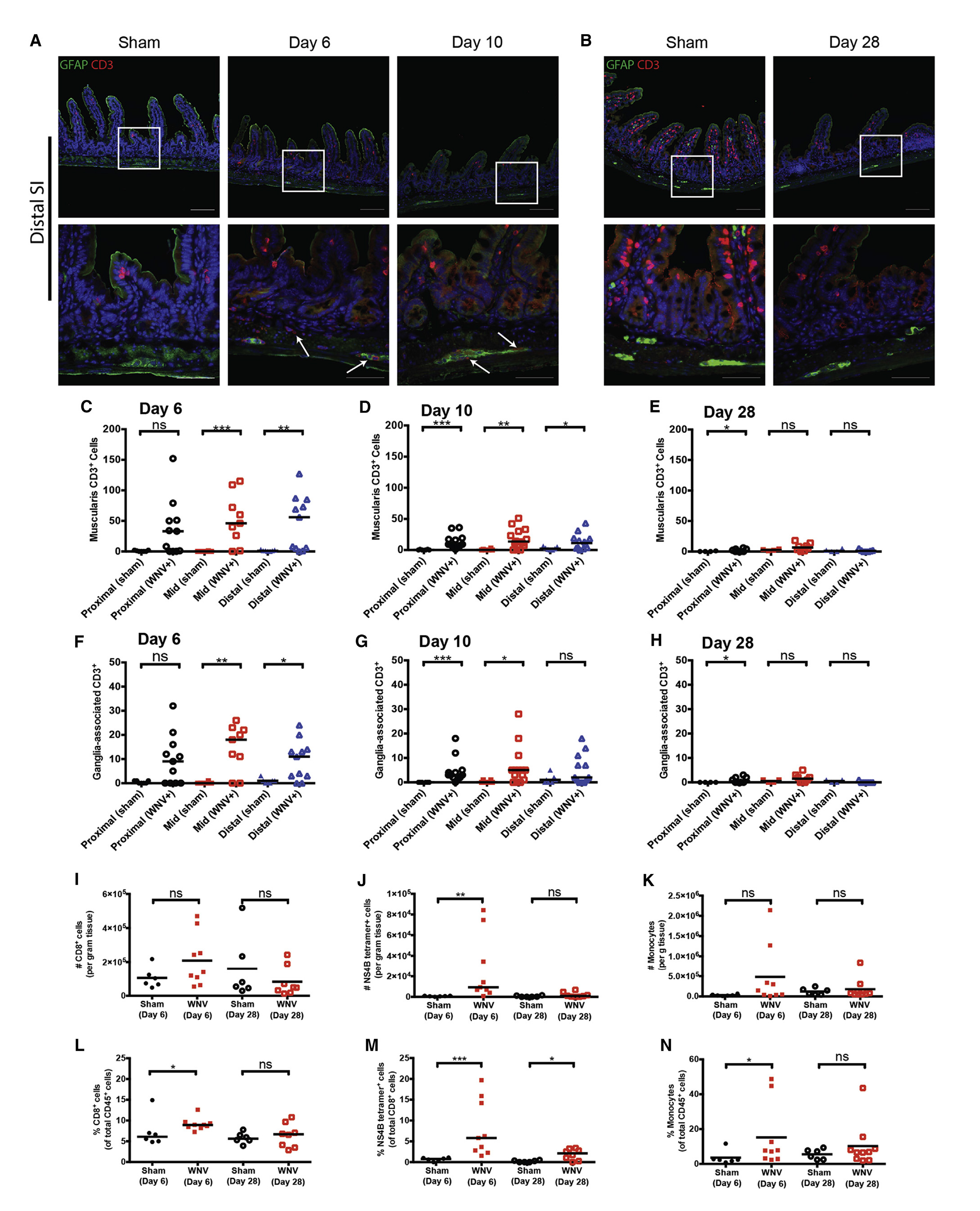 随后,作者对中性粒细胞浸润现象展开研究,结果显示,小肠的肌层和肠肌层神经节出现CD3 T细胞浸润(图4A),在6dpi时,整个胃肠道中肌层CD3 T细胞(图4C)、神经节相关CD3 T细胞数量(图4F)显著增加,10dpi和28dpi,开始减少(图4B,D-E,G-H),这一结果与上述WNV RNA水平降低一致(图2)。研究还发现受WNV感染的胃肠道诱导免疫细胞浸润,其中包括抗原特异性CD8 T细胞的流入(图4I-N)。