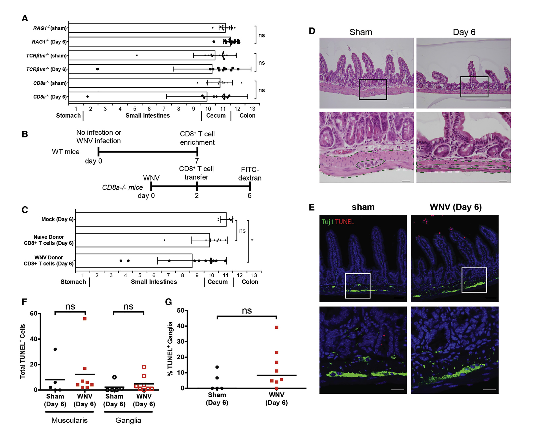 进一步的研究表明,在6dpi时,CD8a-/-鼠小肠末端的肠肌层神经节未出现中性粒细胞趋化(图6D),也只有少量固有肌层、神经节相关TUNEL 细胞被检测出来(图6E)。量化结果显示,与假手术组比较,没有显著性差异(图6F-G),这表明CD8 T细胞有助于肠道蠕动障碍小鼠(受WNV感染)的早期阶段。