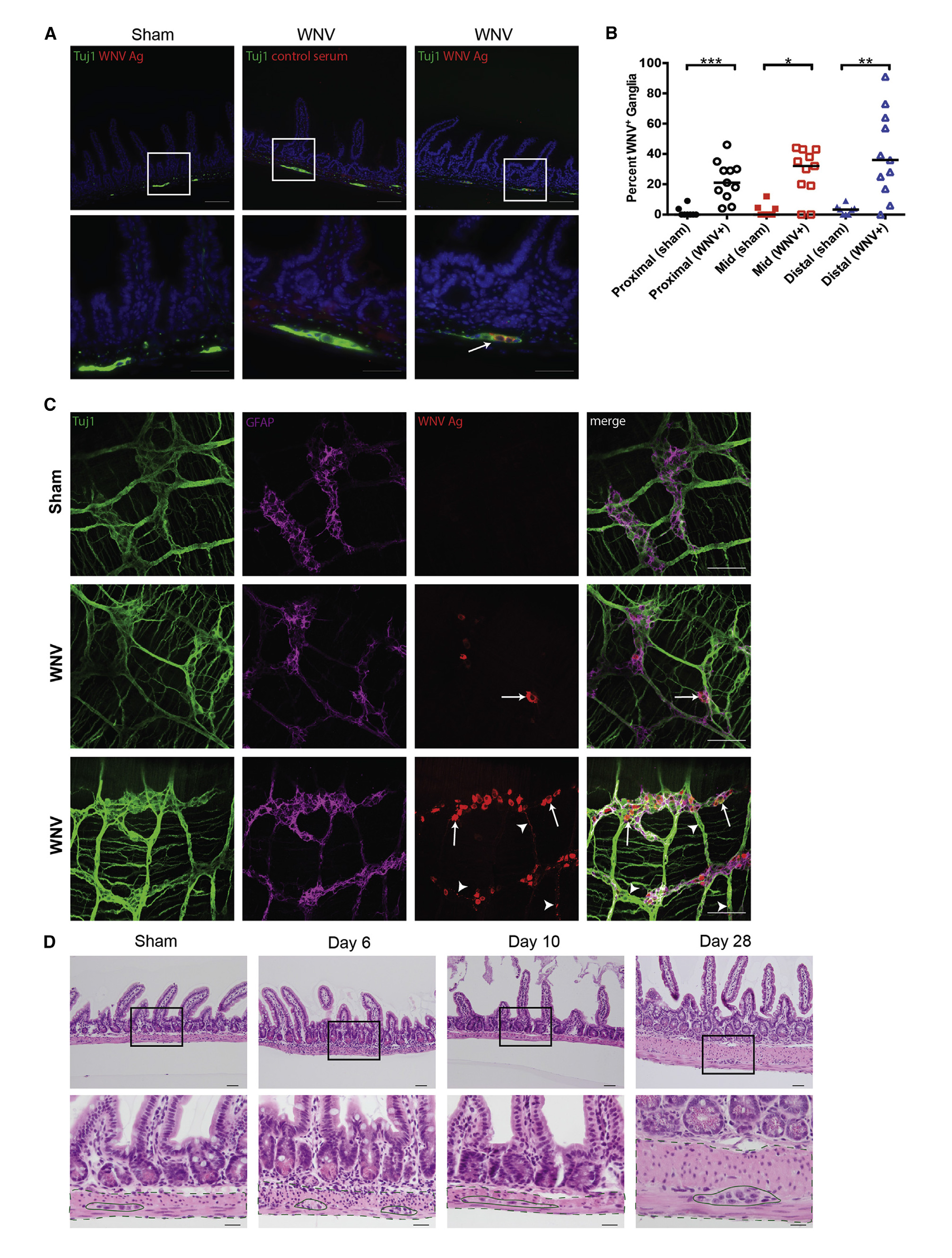 他们进一步研究发现,WNV优先感染肠肌间和粘膜下神经丛的神经节细胞(图3A,3B)。尽管肌肉组织有明显的表型(高水平的病毒RNA,胃肠道转运变化),但在WNV感染后第6天和第10天并未导致上皮细胞死亡量的增加(图3D)。