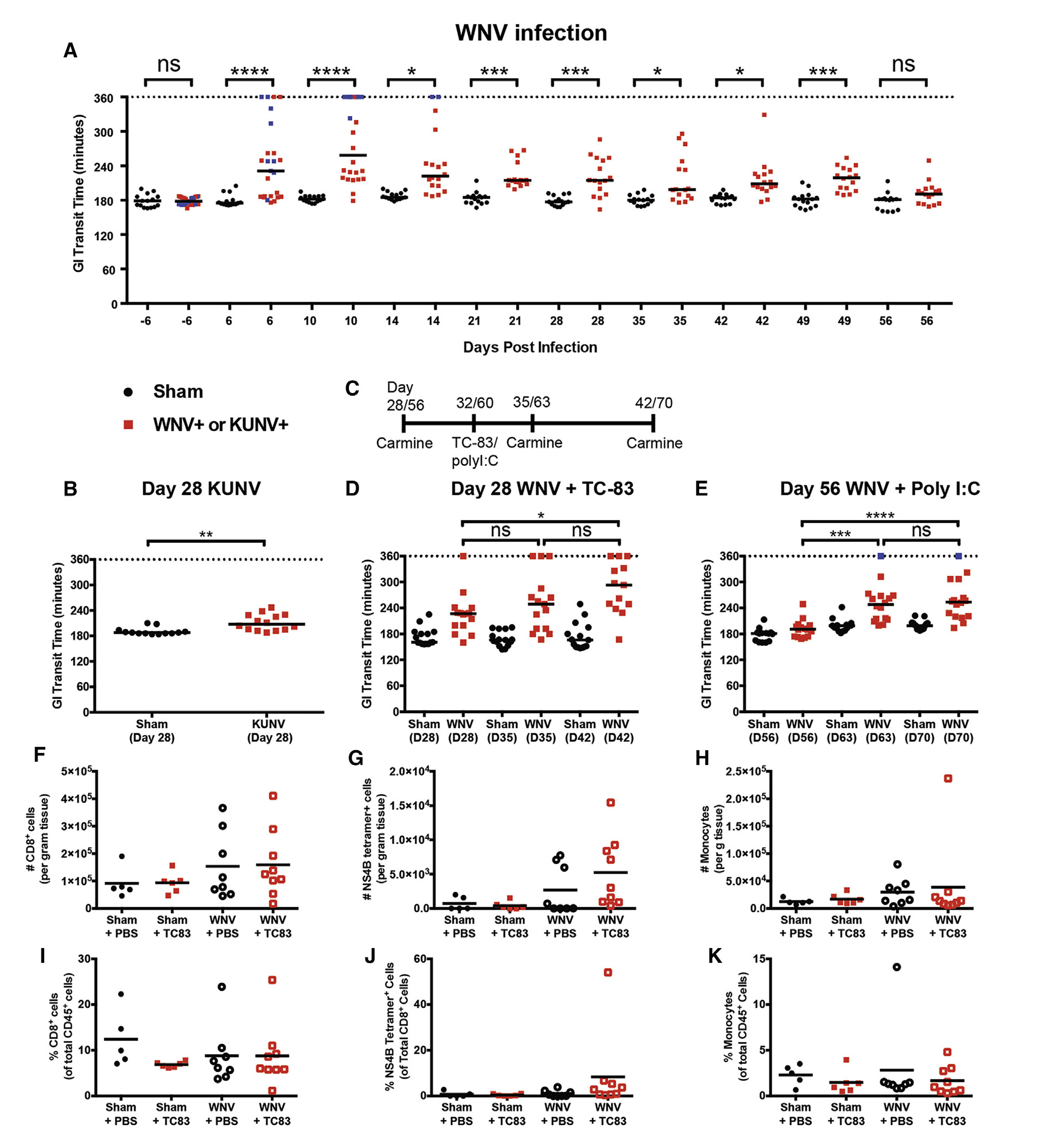 最后,作者对胃肠道转运情况进行纵向研究,发现WNV(或KUNV)诱导的胃肠道运动缺陷一直维持到感染后的第四周和第七周(图7A,7B)。由于患有肠道蠕动障碍患者的一个特点--间歇性出现腹泻、便秘、腹部疼痛的问题[2],因此,他们让小鼠在恢复期接触一种脑炎病毒(VEEV,TC-83 strain,WNV感染第四周注射,图7D)或者一种免疫刺激剂(polyI:C,WNV感染第八周注射,图7E),发现上述的肠道问题又出现了。