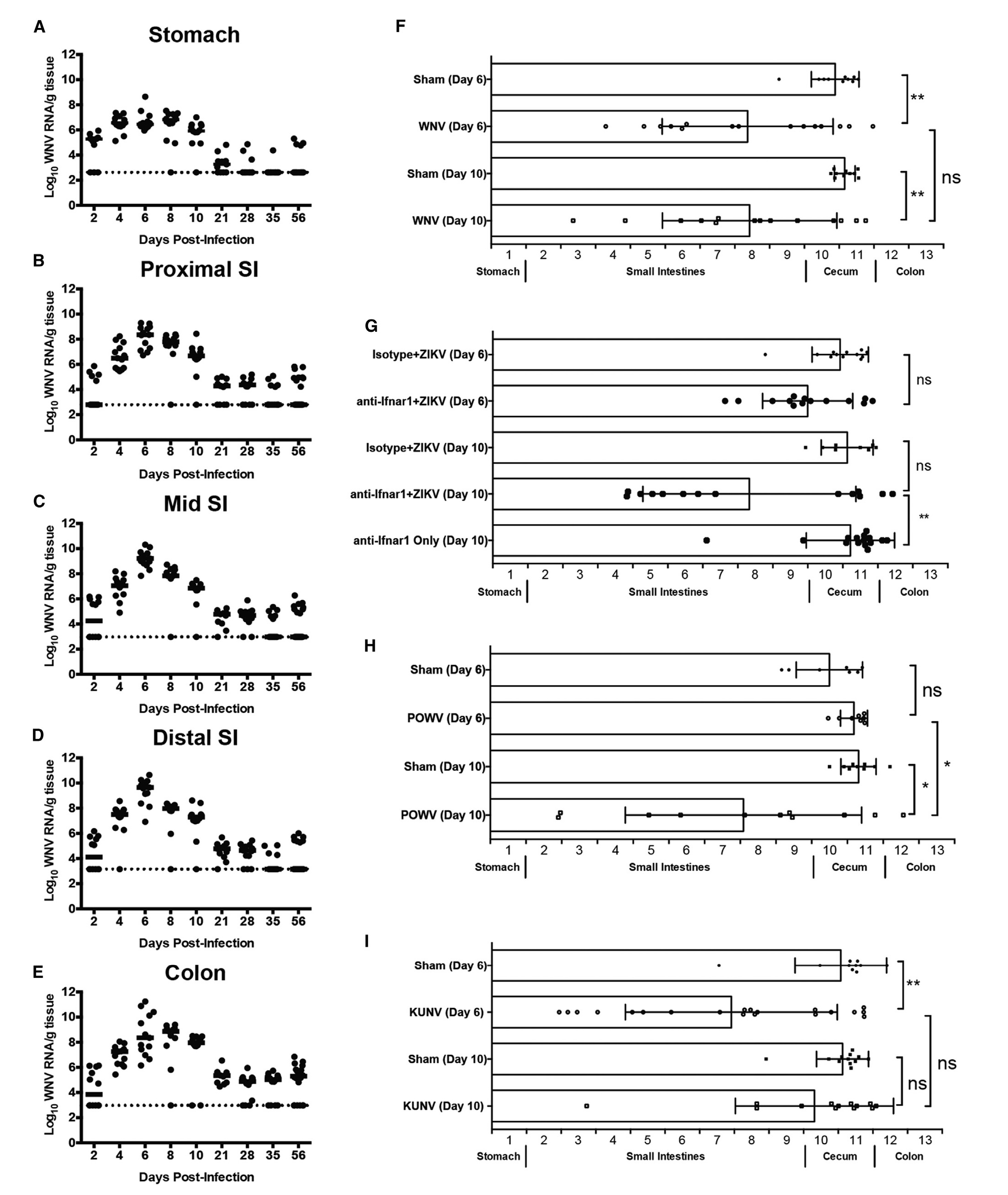 接下来,作者检测了黄病毒RNA水平,结果显示,在感染后4天(4dpi),几乎所有小鼠的整个胃肠道区域均检测到病毒RNA,6-8dpi时病毒RNA水平达到峰值,并在中端和末端小肠中检测到病毒最高滴度。(图2A-E)。