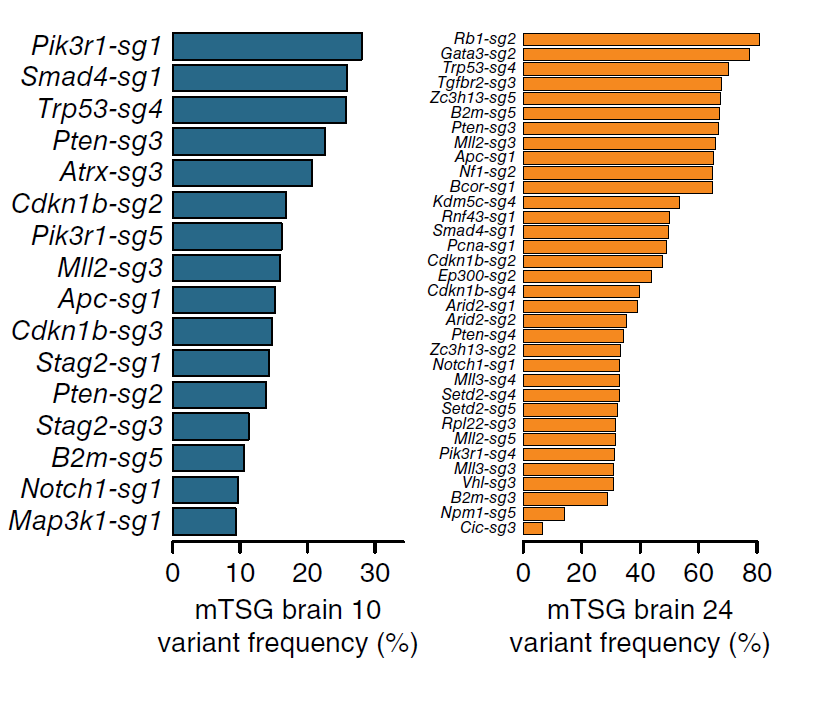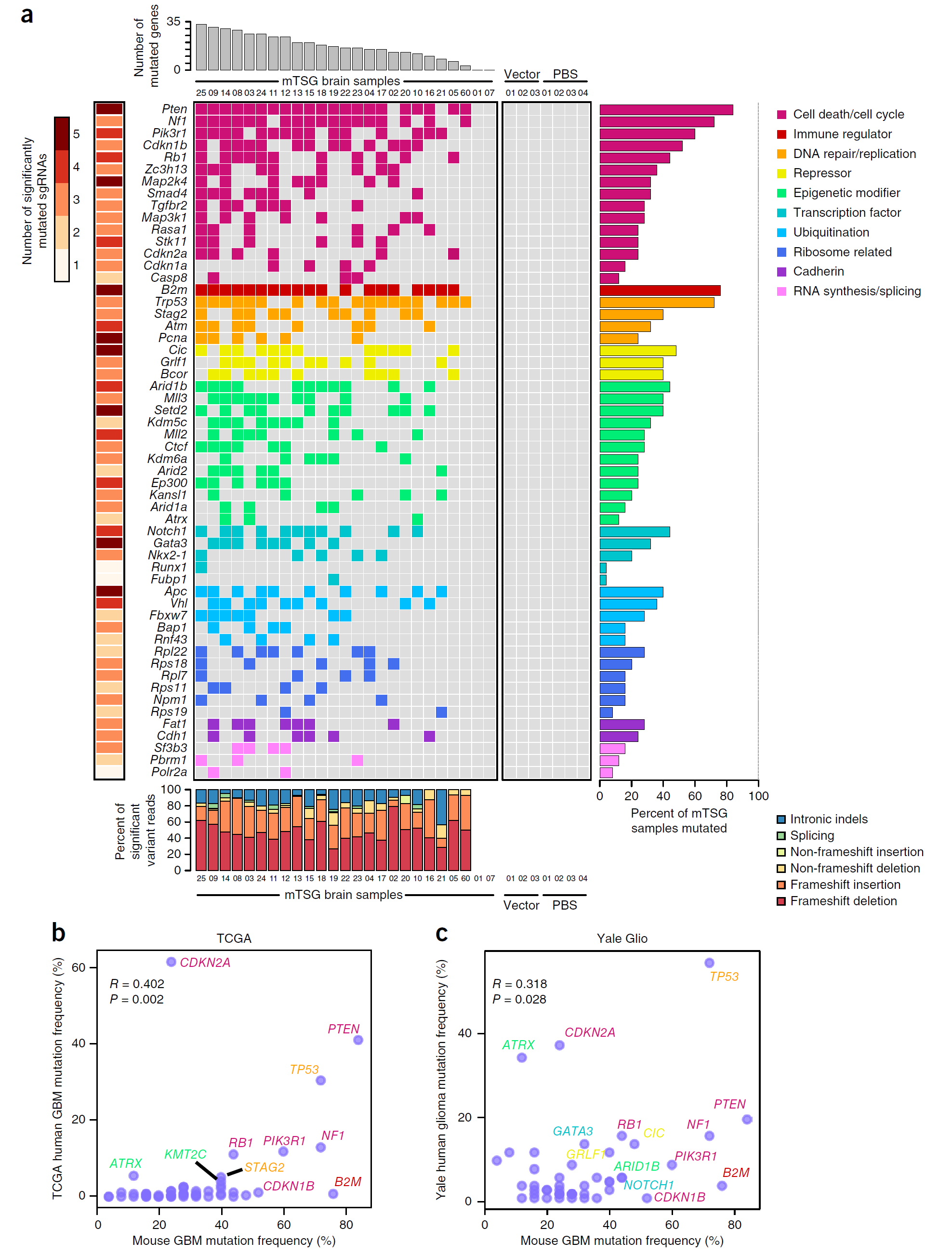 接下来,作者利用sgRNA迷你突变库检测前文发现的高代表性突变基因或共同突变基因的功能,策略如图7a,发现多个或多对突变基因确实能够诱导胶质母细胞瘤的产生(图7)。