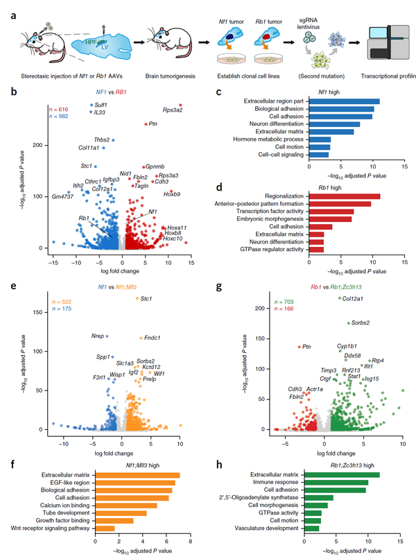 通过对不同突变基因导致的胶质母细胞瘤进行mRNA测序,作者鉴定了不同突变细胞的转录特性(图8)。例如,通过比较Rb1和Nf1突变细胞,作者发现了616个和982个在Rb1细胞和Nf1细胞高表达的基因(图8b)。通过大量的分析,包括共同突变,他们发现Mll3突变会明显影响Nf1突变细胞的转录组表达,而Zc3h13基因突变则会明显影响Rb1突变细胞的表达。
