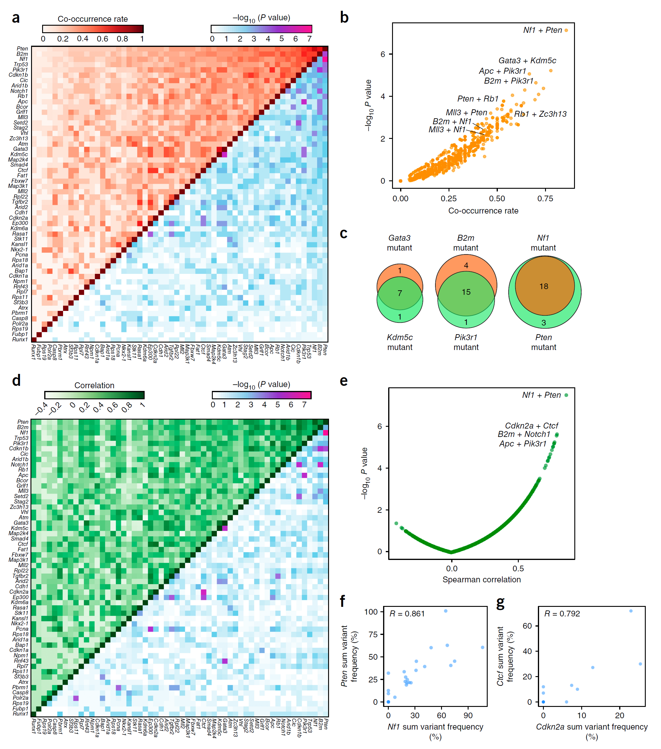 通过并发突变分析,作者从总计1540对潜在突变基因中筛选到76对具显著意义的突变基因,且这些基因也同时在人胶质母细胞瘤患者脑中发生共同突变(图6),例如RB1和TP53, PTEN和RB1, RASA1和STK11等共同突变。