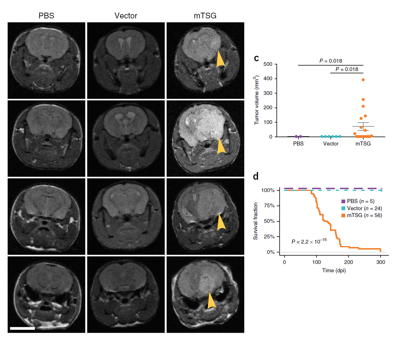 通过将抑癌基因(mTSG)库(该库包含针对Trp53的sgRNA,用于促进小鼠组织的肿瘤发生,亦包含其他的显著突变基因靶点sgRNA)注射到脑中,配合MRI扫描,作者发现注射mTSG库的动物明显出现了肿瘤,且动物的生存周期亦明显降低(图2)。这说明AAV-CRISPR策略能够在小鼠体内诱导肿瘤的产生。