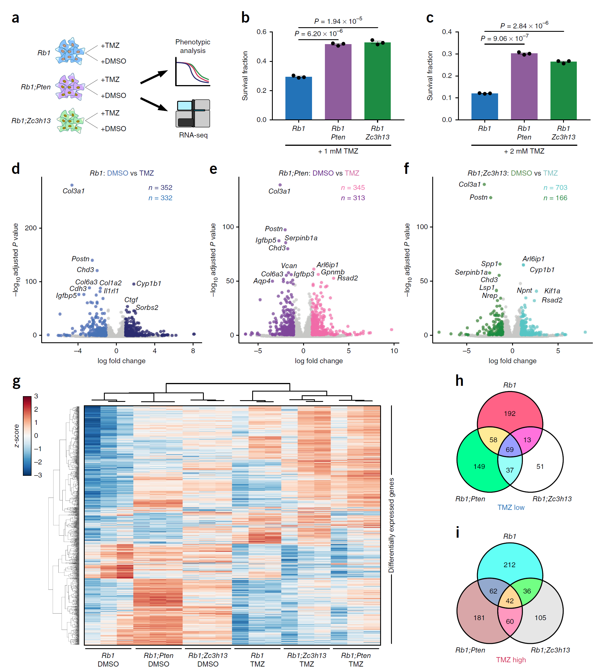 文末,作者设计了药物治疗的RNA测序实验(图9),结果发现Rb1突变的胶质瘤细胞中Zc3h13或Pten基因突变会增加TMZ化疗药物的耐药性,这提示未来的癌症需要考虑不同突变基因的耐药性问题。