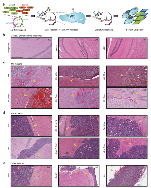 为了在小鼠脑中直接检测胶质母细胞瘤相关的显著突变基因功能,作者开发了一套基于AAV载体和CRISPR技术的在体扫描策略,直接在小鼠脑原位构建胶质母细胞瘤模型(图1)。