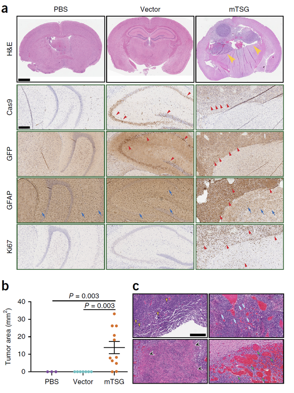 通过免疫组化实验,作者发现AAV-mTSG注射的小鼠所产生的肿瘤非常明显,其特征与人类胶质母细胞瘤患者的肿瘤特征非常像,提示AAV-mTSG成功诱导了胶质母细胞瘤模型(图3)。