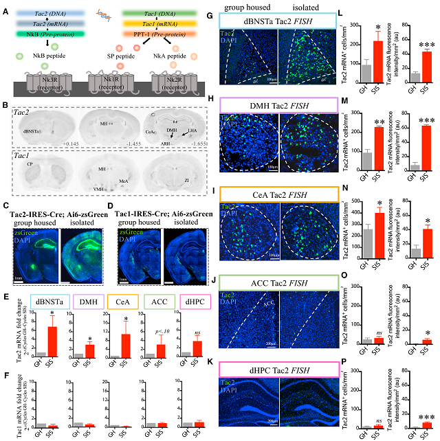 为研究SIS是否影响速激肽的表达,作者使用Tac1-Cre、Tac2-Cre小鼠与Cre依赖性荧光报告鼠杂交,将其子代进行2周SIS处理,发现在背侧终纹床核(dBNSTa)、中央杏仁核(CeA)、背内侧下丘脑(DMH)、前扣带皮层(ACC)以及背侧海马(dHPC)中,Tac2诱导的荧光表达量显著升高,而Tac1诱导的荧光表达量不变。表明,SIS可诱发Tac2表达量升高,而不改变Tac1的表达量,后续qRT-PCR与荧光原位杂交实验(FISH)同样证实了这一结论(图2C-P)。