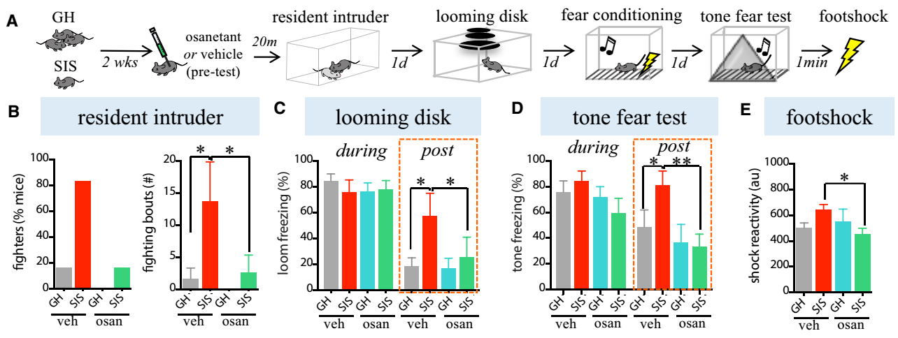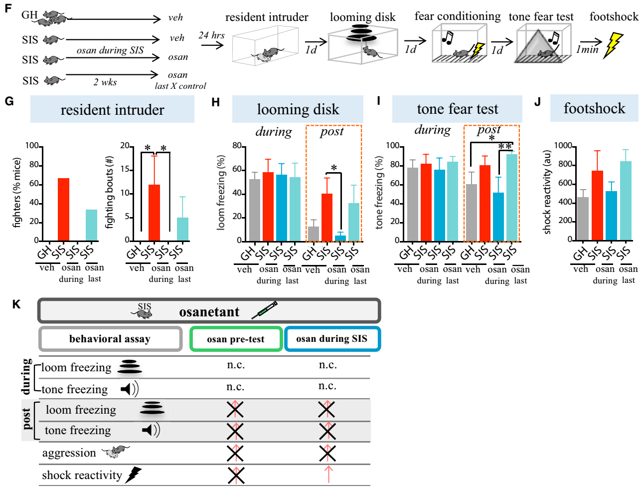 接下来,为探究SIS过程中Tac2信号的必要性,作者在小鼠2周SIS的过程中每天腹腔注射奥沙奈坦,行为学检验之前不再注射奥沙奈坦,发现SIS诱发的攻击性行为以及本能恐惧、习得性恐惧性行为同样大幅减少,只有对足底电击恐惧性反应的减小程度无显著性差异(图4)。