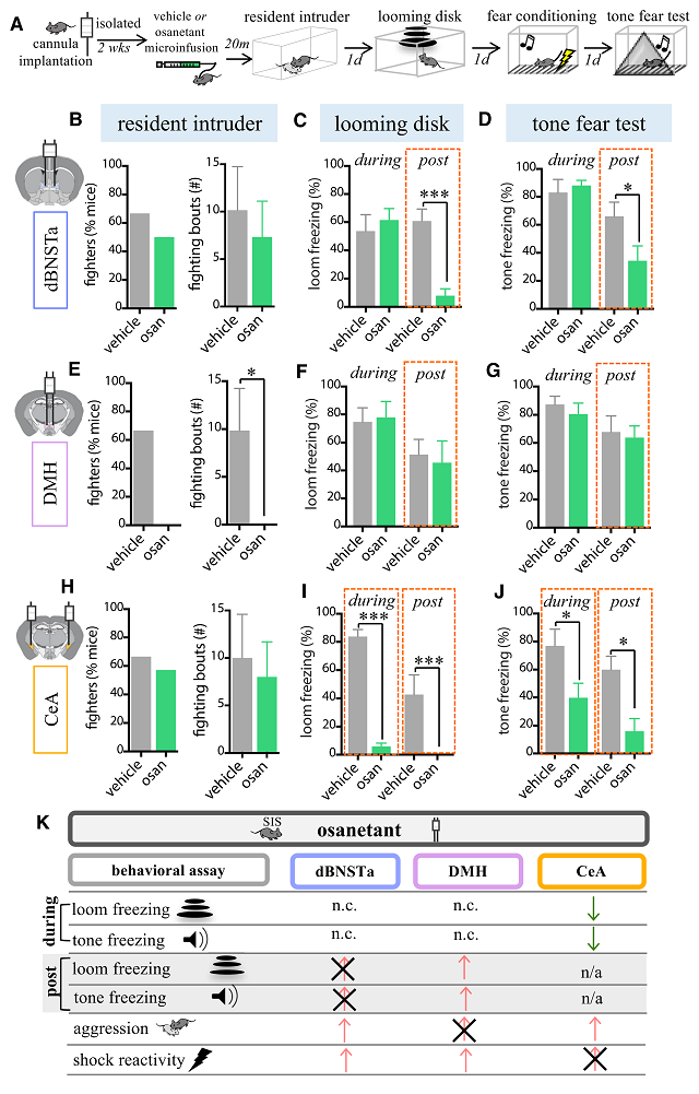 从上文结果AG尊时凯龙人生就博得知SIS会引起Tac2表达量升高,而Tac2编码NkB,NkB作用于神经激肽3受体(Nk3R)(图2A)。接下来,作者希望了解Nk3R是否参与SIS的行为学效应,他们在小鼠中腹腔注射奥沙奈坦——一种可穿越血脑屏障的Nk3R拮抗剂,20分钟后,他们发现SIS诱发的攻击性行为以及本能恐惧、习得性恐惧性行为大幅减少(图3)。