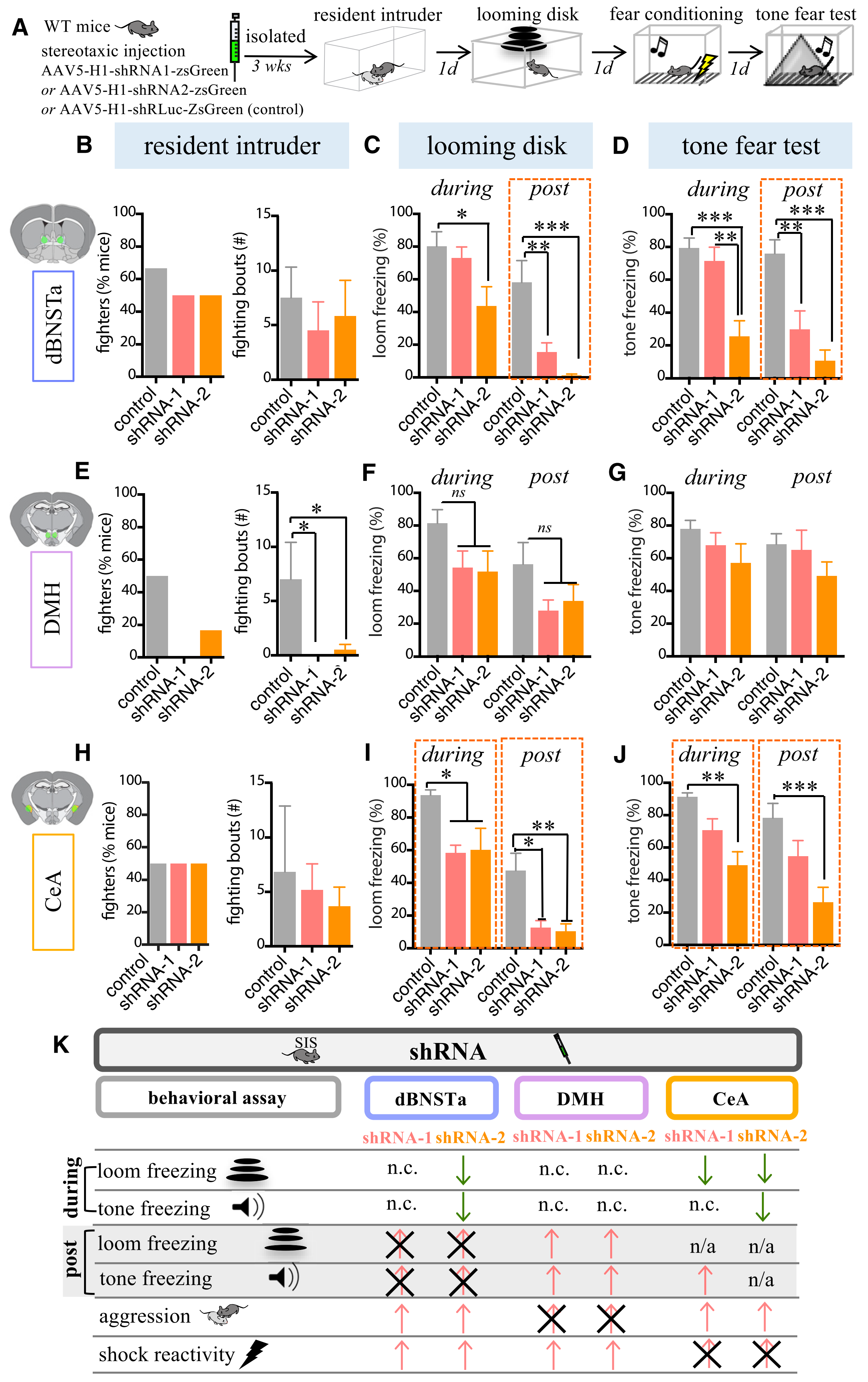 为验证上述3个脑区中Tac2基因的表达在SIS效应中的必要性,他们在小鼠的dBNSTa、DMH或CeA中双侧注射AAV5-H1-shRNA1/shRNA2病毒,下调Tac2基因的表达。结果发现,SIS处理这些小鼠2周后,沉默dBNSTa或CeA中Tac2基因会减少SIS诱发的本能恐惧、习得性恐惧性行为,但不影响攻击性行为,其中沉默dBNSTa或CeA中Tac2基因均会减少刺激过程中的恐惧行为;而沉默DMH中Tac2基因减少SIS诱发的攻击性行为,而不影响恐惧行为(图7),与图5、图6中的结果相一致。