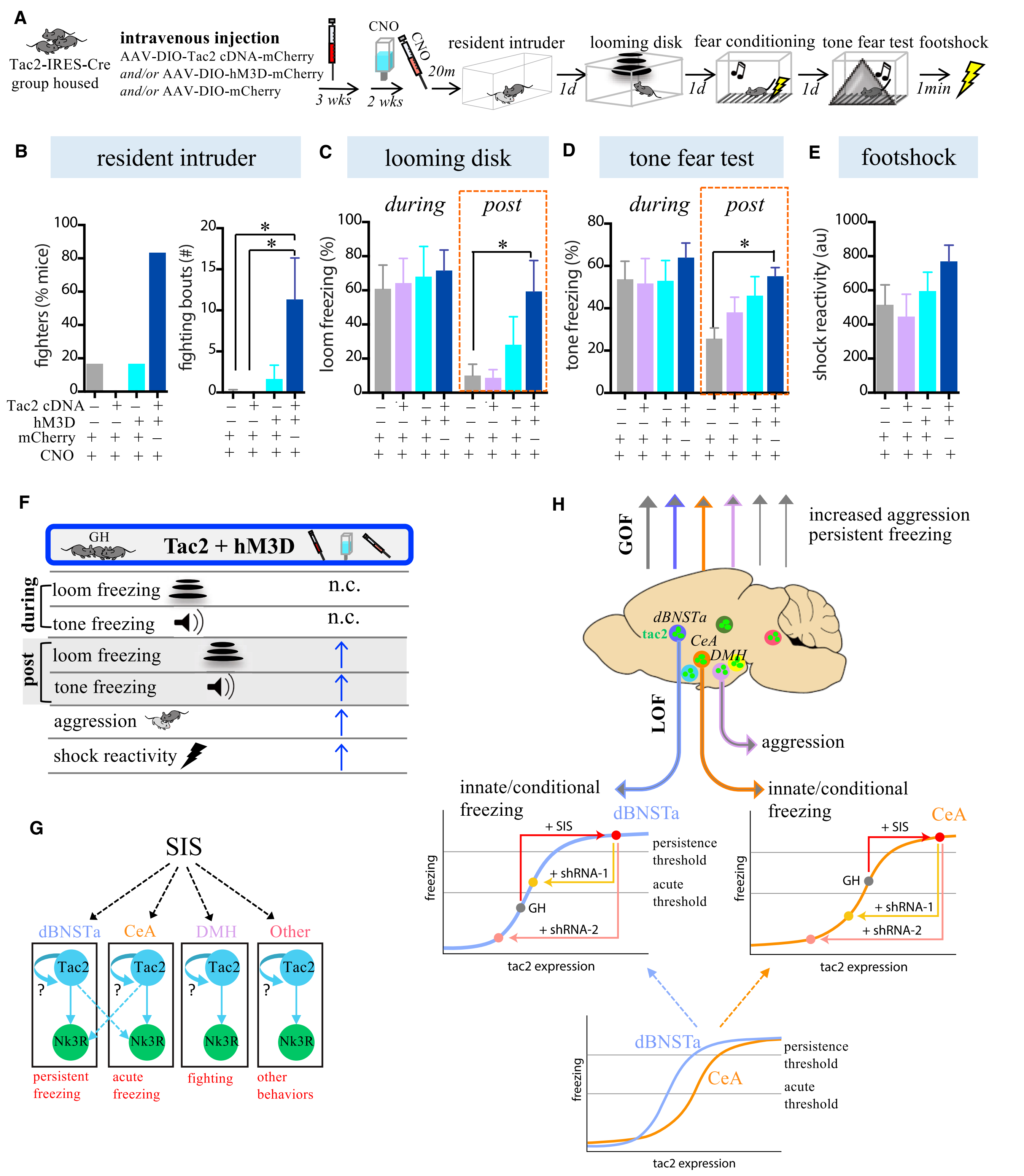 最后,作者在Tac2-Cre小鼠中静脉注射AAV-DIO-hM3D和AAV-DIO-Tac2 cDNA,其AAV的血清型为PHP.B,可通过血脑屏障,并在饮水中加入CNO长达2周,以化学激活Tac2神经元。他们发现这些小鼠与SIS处理后的小鼠相似,其攻击性行为增加,对阴影、声音信号、足底点击、危险性超声的恐惧反应也显著加大(图8A-F)。