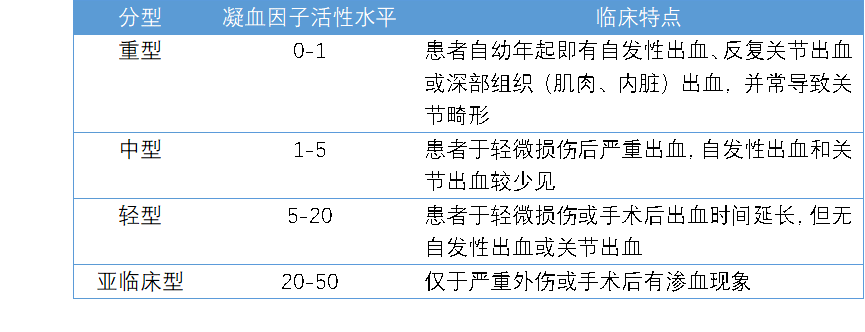 根据凝血因子活性水平,又可将其分为重型、中型、轻型和亚临床型: