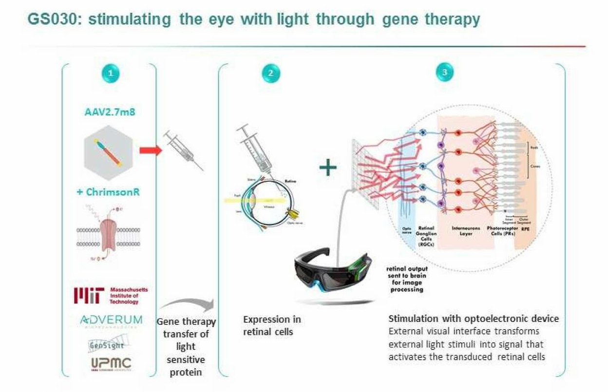 GS030是基于GenSight技术开发的一种新型光遗传学技术平台,该平台利用基因治疗手段,借助单次玻璃体内注射,将携带光敏蛋白基因的病毒注射到视网膜,并感染视网膜神经节细胞,表达光敏蛋白使其对光产生反应,从而获得对光的感受。GS030将单次玻璃体内注射的基因治疗(GS030- dp)与可穿戴式光电视觉刺激装置(GS030- md)相结合。目前,GS030在美国和欧洲被授予孤儿药称号。