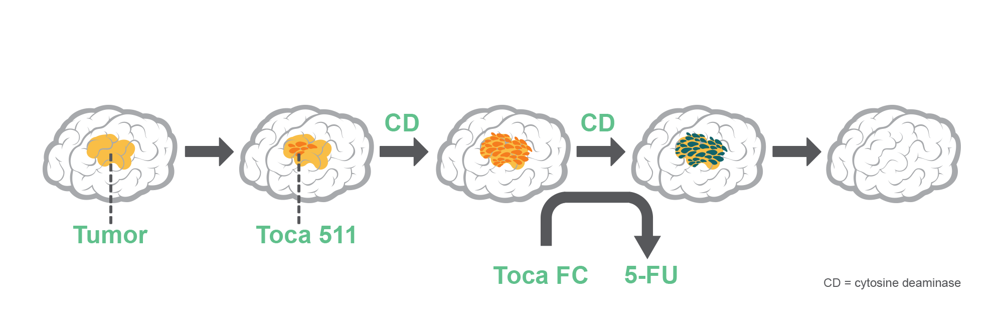 Toca 511是一种可注射的逆转录病毒复制载体(RRV),它能编码前体活化酶——胞嘧啶脱氨酶(CD)。CD来自酵母,人类天然不具有这种基因。Toca 511可以被选择性递送至癌细胞,这意味着被感染的癌细胞会选择性携带CD基因并产生CD蛋白。Toca FC是一种口服前药,配合Toca 511共同完成抗癌症治疗,在动物模型中,Tocagen已经证明,在产生CD蛋白的被Toca 511感染的癌细胞中,5-FC(5-氟胞嘧啶(5-FC)单独作为抗癌药物是没有活性的)会以高浓度转化为抗癌药物5-FU。Toca 511和Toca FC组合能直接杀死癌细胞和免疫抑制性骨髓细胞,从而激活免疫系统对抗癌症。