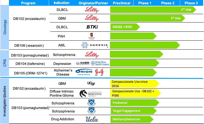 该公司还有另外五个针对不同疾病的项目:用于治疗精神分裂症的DB103、用于治疗抑郁症的DB104、用于治疗阿尔茨海默病的DB105、用于治疗急性髓系白血病(AML)的DB106和用于治疗复发性高等级胶质瘤的DB107。