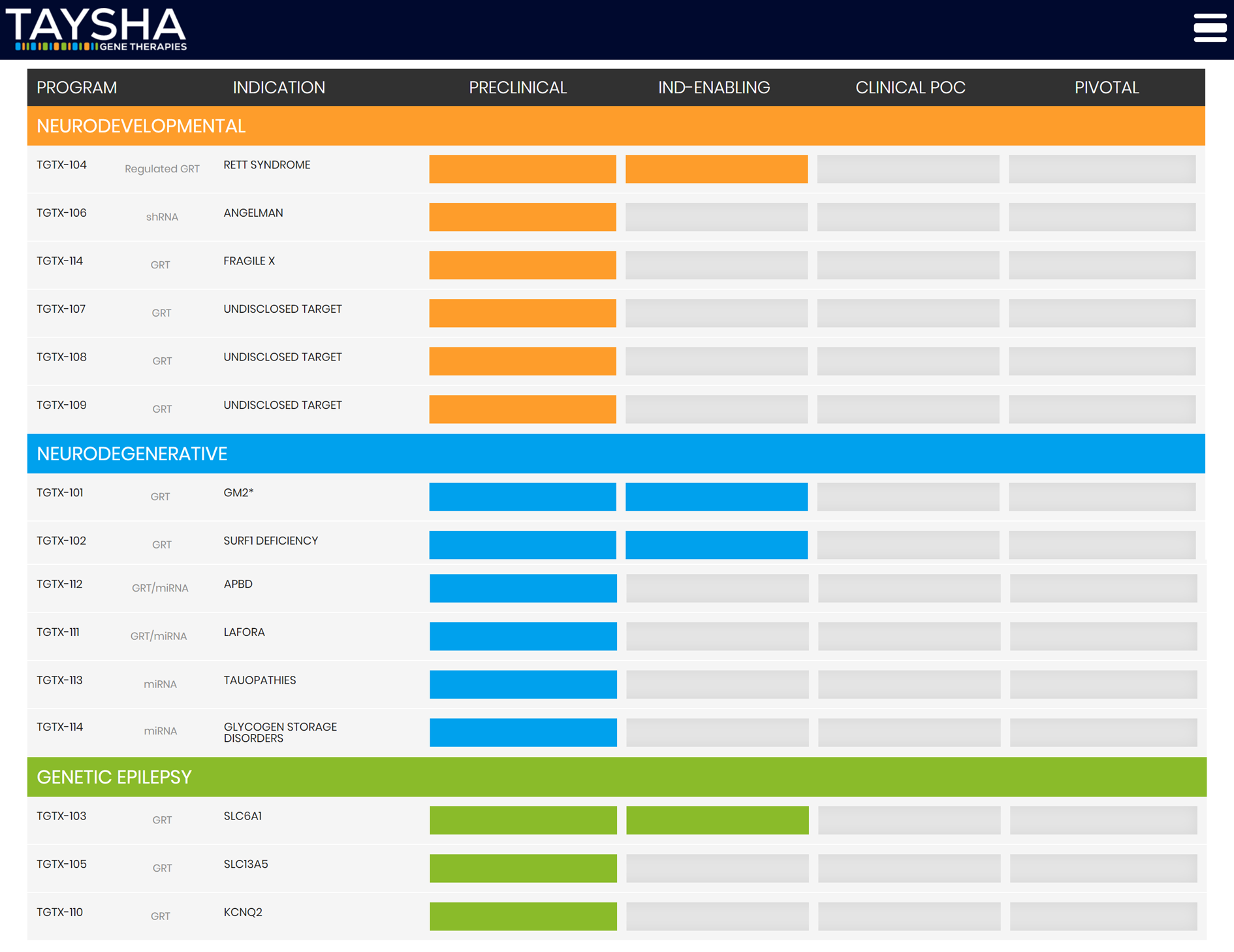 他们将先期推动针对神经发育、神经再生和癫痫的四个项目。包括TGTX-101,这是一种罕见GM2神经节(GM2-Gangliosesidosis,也被称作Tay–Sachs and Sandhoff病)的基因替代疗法,以及另外三种针对罕见神经系统疾病(SURF1缺陷、SLC6A1单倍性不全和Rett综合征)的疗法。