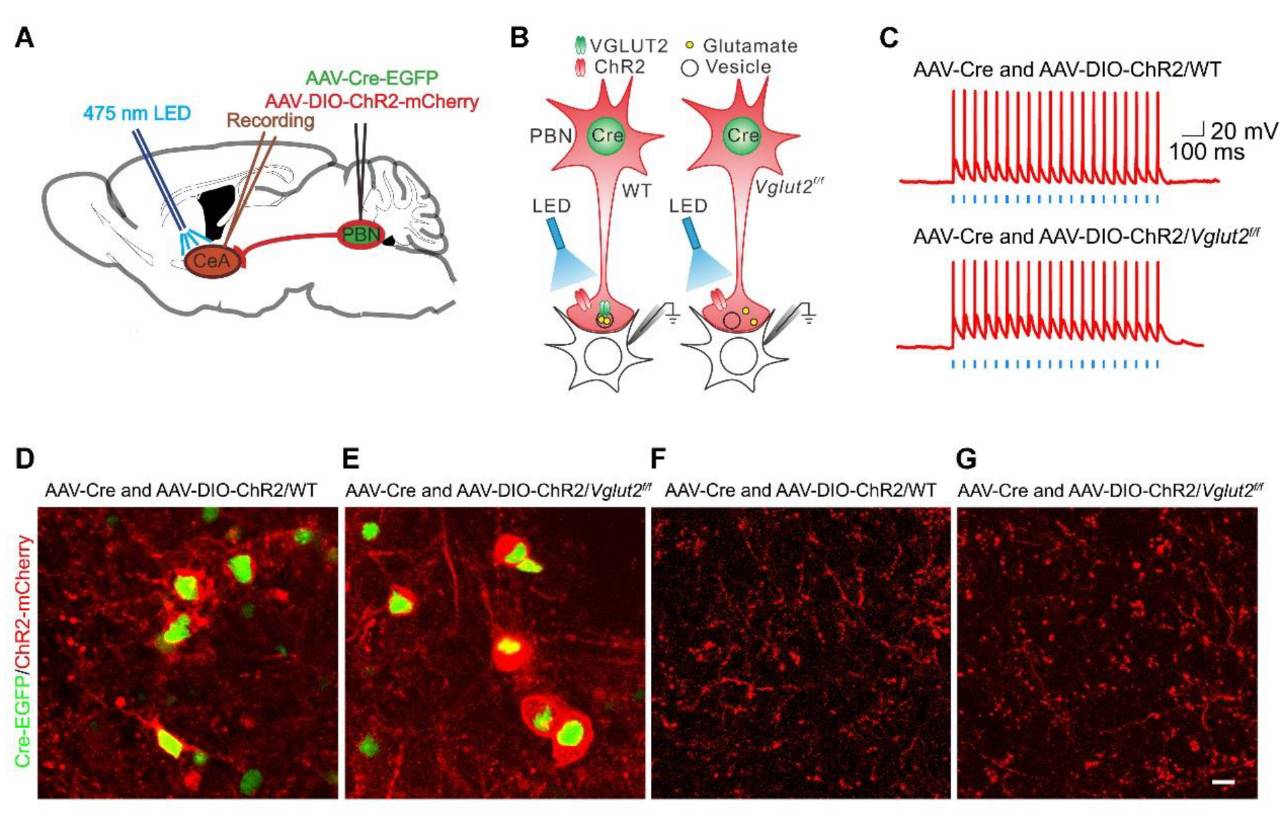 随后,通过在Vglut2基因双侧插入loxP的转基因鼠双侧臂旁核注射AAV-Cre病毒,作者在这些神经元敲除了Vglut2基因,从而阻断了臂旁核谷氨酸能神经元的活动(图7)。
