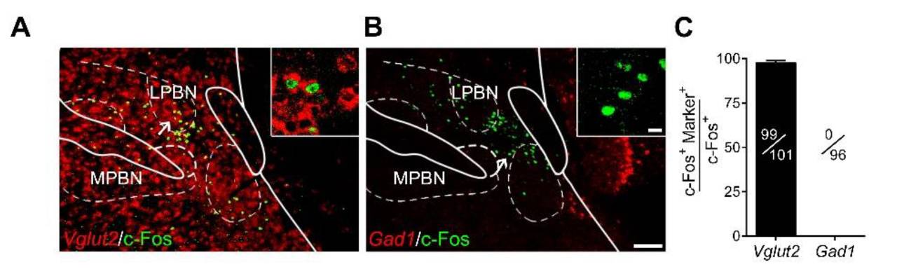 通过检测臂旁核神经元由痒刺激激活c-Fos表达的细胞与Vglut2或Gad1共标的情况,可以提示参与痒传递的臂旁核神经元绝大部分都是Vglut2阳性的谷氨酸能神经元(图6)。