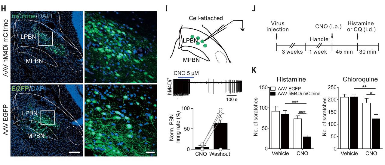 为验证臂旁核神经元活动与搔痒行为的关系,进一步的实验采用化学遗传学(DREADD)手段,借助AAV载体在双侧臂旁核表达抑制性化学敏感通道hM4Di,结果发现给予动物CNO激活hM4Di受体后,小鼠在痒刺激之后的搔痒行为明显减少(图5)。